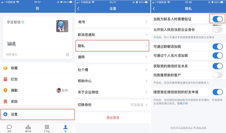 想要企业微信自动接受好友,只需要打开企业微信app – 「我」 – 「设置」 – 「隐私」页面,关闭「加我为联系人为联系人时需要验证」按钮即可。