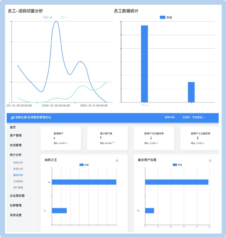 这样一来,店主一天拉新了多少顾客,各门店引流情况如何?哪个店主业绩最佳?谁被客户拉黑/删除最多?连锁门店在语鹦企服后台就可以一键查询,一目了然!