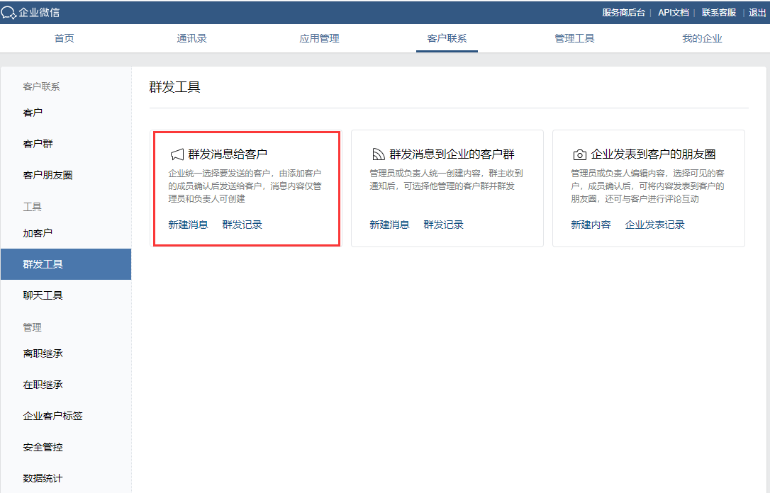 企业微信运营者进入到企业微信管理后台,在「客户联系」-「群发工具」模块,找到「群发消息给客户」-「新建消息」。