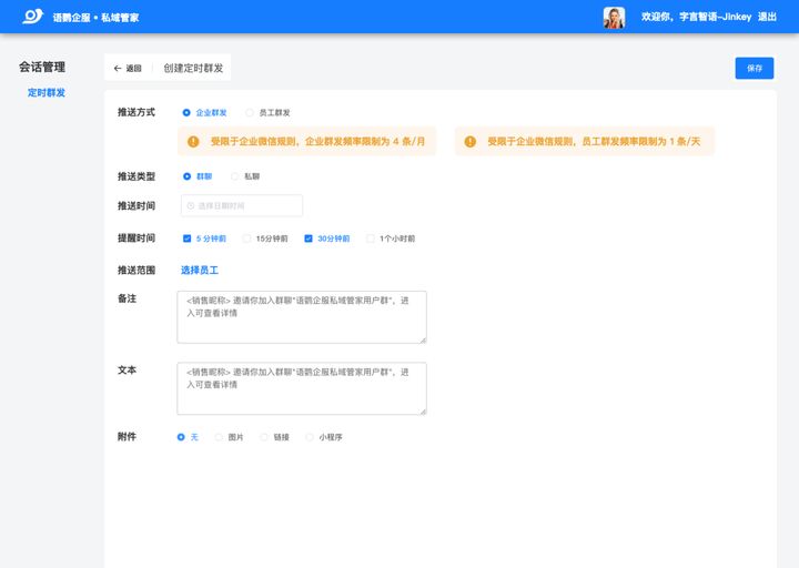 在语鹦企服管理后台,选择会话管理栏,找到定时群发功能模块,管理员可以创建定时群发任务,通过选择推送方式和推送类型,并且设置好时间、人员、以及消息内容,这样系统就会根据你设置的时间而进行提醒。