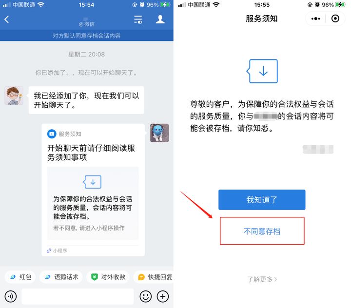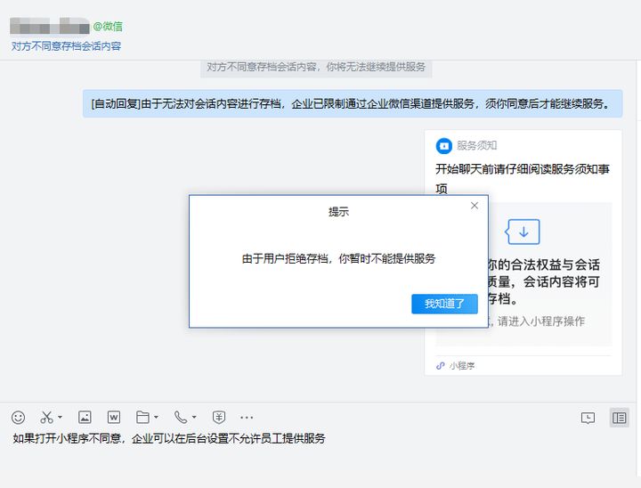 其实如果客户不进行其他操作,系统就会默认为同意存档,并且企业可以在企业微信管理后台设置【当外部联系人不同意存档时,限制员工提供服务】。