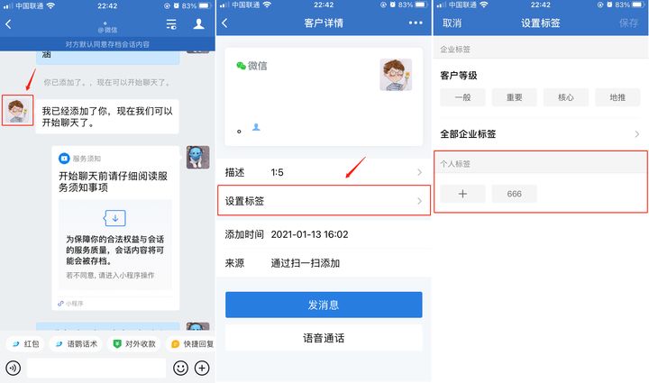 企业微信本身是无法自动打标签的,但是透过语鹦企服可以事先设置好标签,自动给新添加的客户打上后台设定好的标签,以便企业更好的运营管理,对于日后的营销活动更有针对性,更能使企业效益最大化。