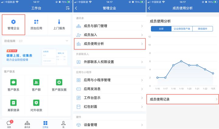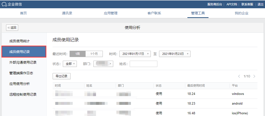 点击【工作台】—【管理企业】—【成员使用分析】—【成员使用记录】即可查看企业微信员工的在线时长,我们还可以选择特定的日期进行查看。