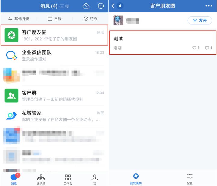 而在客户进行点赞、评论之后,我们的企业微信消息页面会出现推送,提示客户在我们的朋友圈进行了互动,以便我们及时进行查看和回复。
