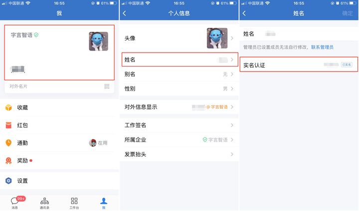 想要完成实名认证,步骤非常简单,员工在企业微信中的【我】—【个人信息】—【姓名】上传身份证等信息即可实现。