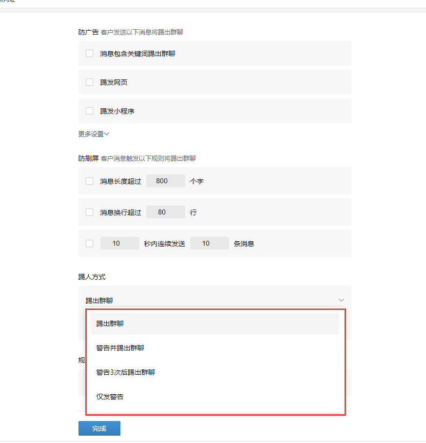 想要杜绝此类信息在群内恶意刷屏,我们可以选择使用企业微信的防骚扰功能,在【客户联系】—【安全管控】—【防骚扰】设置规则后可以根据需求选择踢出群聊、警告并提出群聊、警告3次后踢出群聊、仅发警告,便能维持群内基本氛围和提高群成员的积极性。