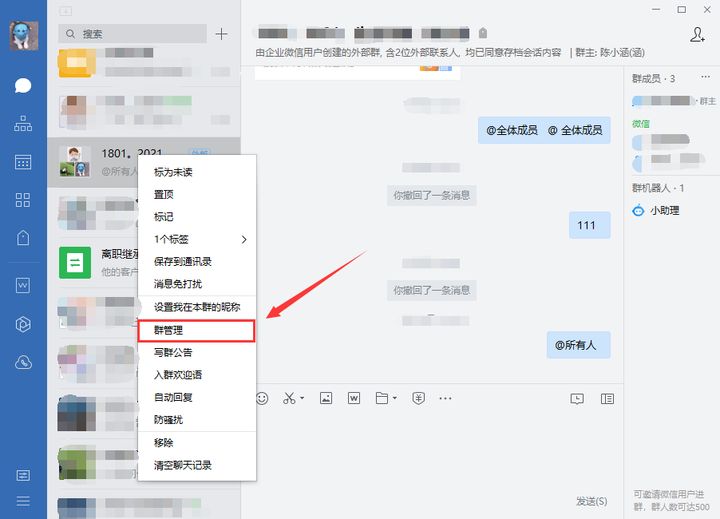 如果群主不方便使用手机,也可在PC端进行,将鼠标放在群聊会话框上,点击右键,再进入群管理页面,添加群管理员。