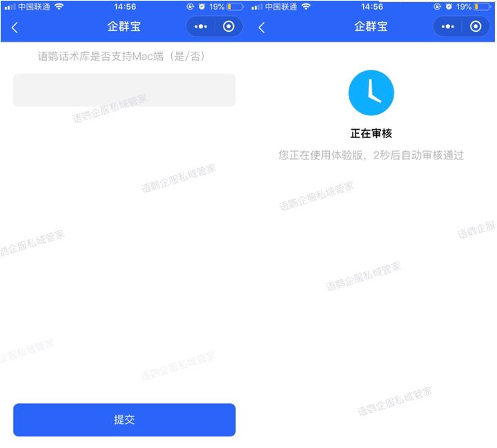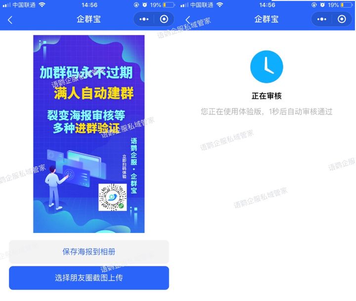 但是这些操作治标不治本,如果想从源头杜绝这种水军入群,推荐使用语鹦企服的企群宝,一款进群需要验证的审核神器,进群先认证杜绝水军爆粉。第一种方式:企业将想要裂变的海报保存到企群宝,用户只能通过分享海报并上传至朋友圈的截图,审核通过后才能进群。