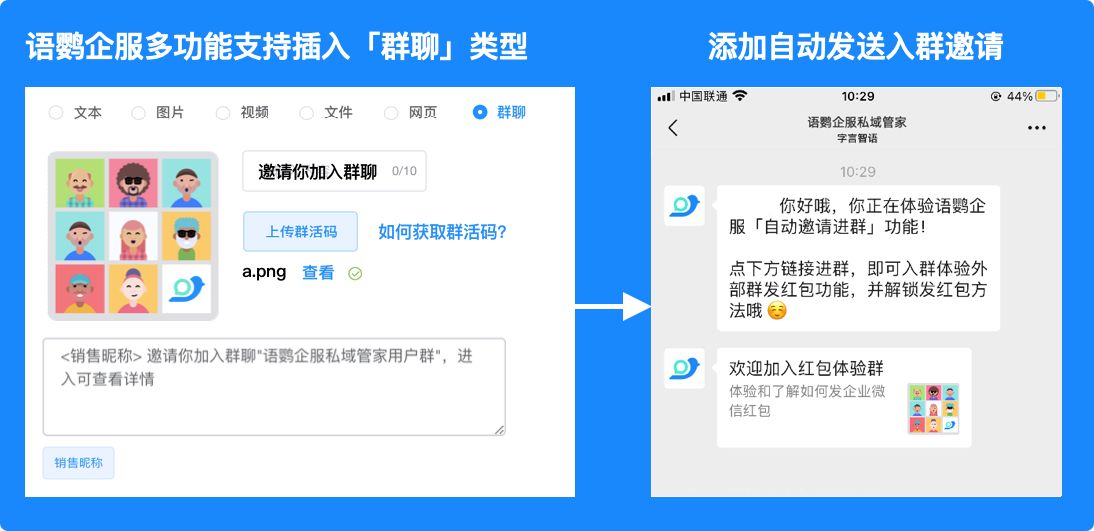 很多小伙伴有自动邀请客户进群的需求,本次更新,语鹦企服个性化欢迎语、超级活码、员工活码等功能模块,新增支持插入群聊类型了。