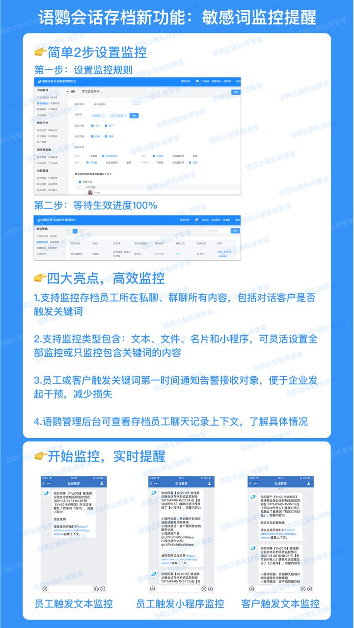 本次更新,更是支持了聊天敏感词监控。只要员工开启了会话内容存档,无论是私聊还是群聊,无论是存档员工还是对话的客户,只要触发了敏感词,都能通过语鹦企服系统实时提醒会话质检员,从而及时干预,降低损失~