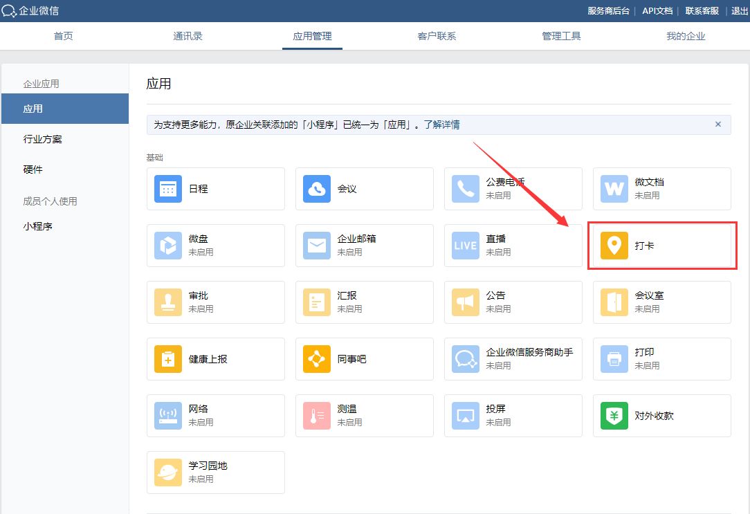 首先,打开企业微信的后台,点击【企业应用】—【打卡】,点击开启打卡模式。