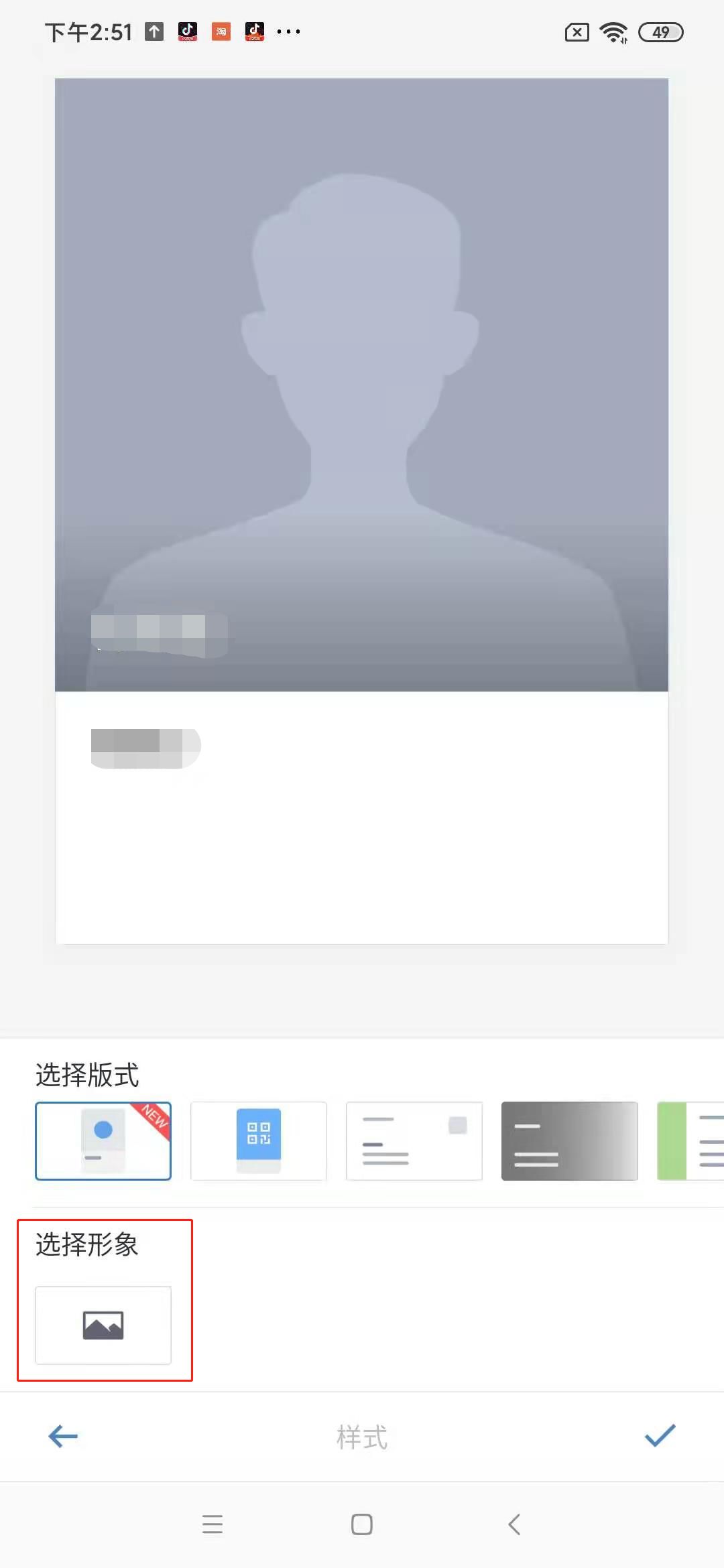 当打开对外名片没有头像时,我们可以在对外名片的页面中选择右上角的编辑,在这里我们可以选择样式与对外信息。在样式页面的下方,有选择形象的选项,从手机图库中选择头像上传就设置好了。