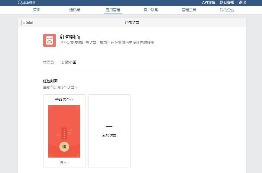 其实步骤很简单,首先打开企业微信的管理后台,点击【应用管理】—【红包封面】,再点击【添加封面】。