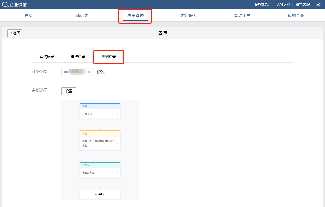 想要设置审批流程,步骤非常简单。我们仅需要打开企业微信的后台,点击【应用管理审批】,再根据需要设置合适的模板,最后点击【规则设置】就能设置审批流程了。