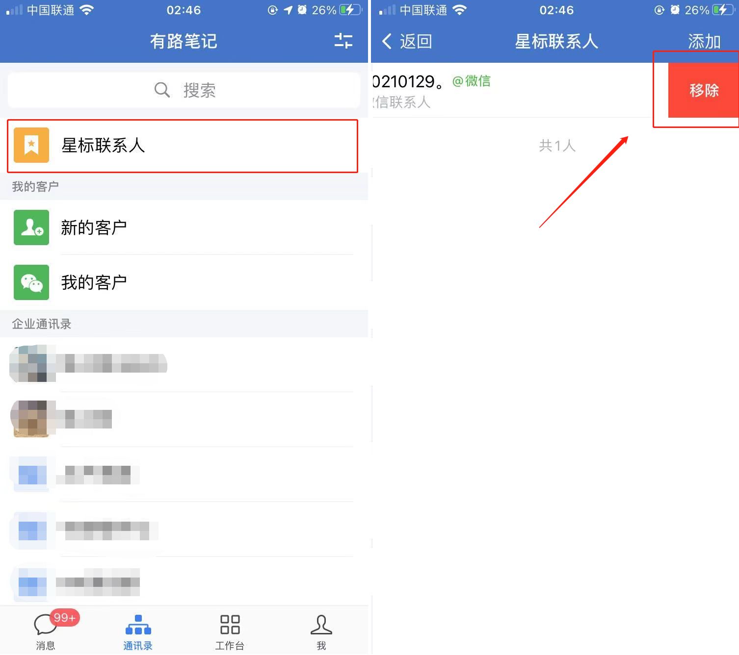如果需要取消星标的联系人比较多,在通讯录上方的【星标联系人】中,选择联系人左滑点击【移除】即可。