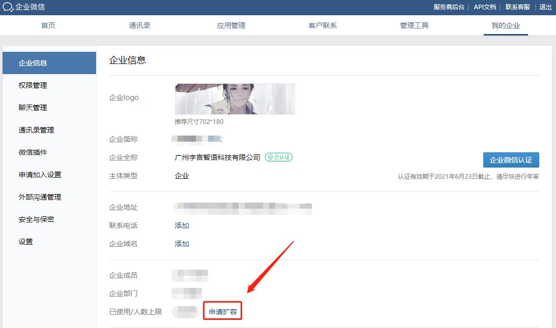 想要实现企业微信通讯录扩容,需要先完成认证。认证后,管理员打开企业微信管理后台,找到【我的企业】-【企业信息】-【人数上限】,点击旁边的【申请扩容】即可。需要注意的是,申请幅度不要过大,数量过多时建议分批申请扩容。