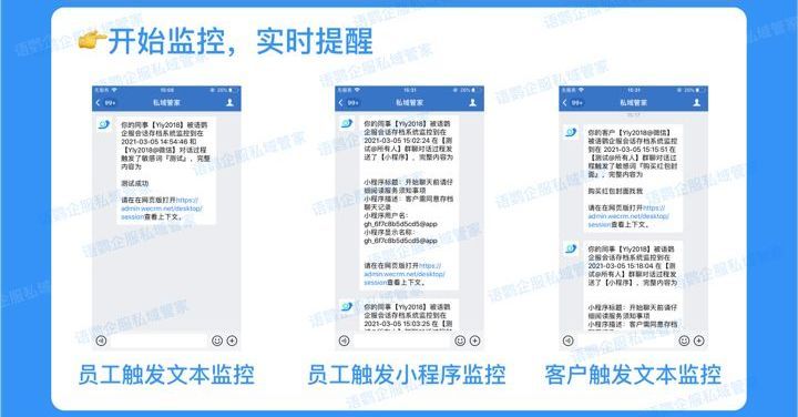 开通语鹦企服的会话存档功能,能实现违规提醒,及时告知管理者员工的违规行为;还能实现删除联系人提醒,客户如果删除了员工的企业微信或者员工删除了客户的信息,系统也会实时提醒,以便造成不必要的损失。