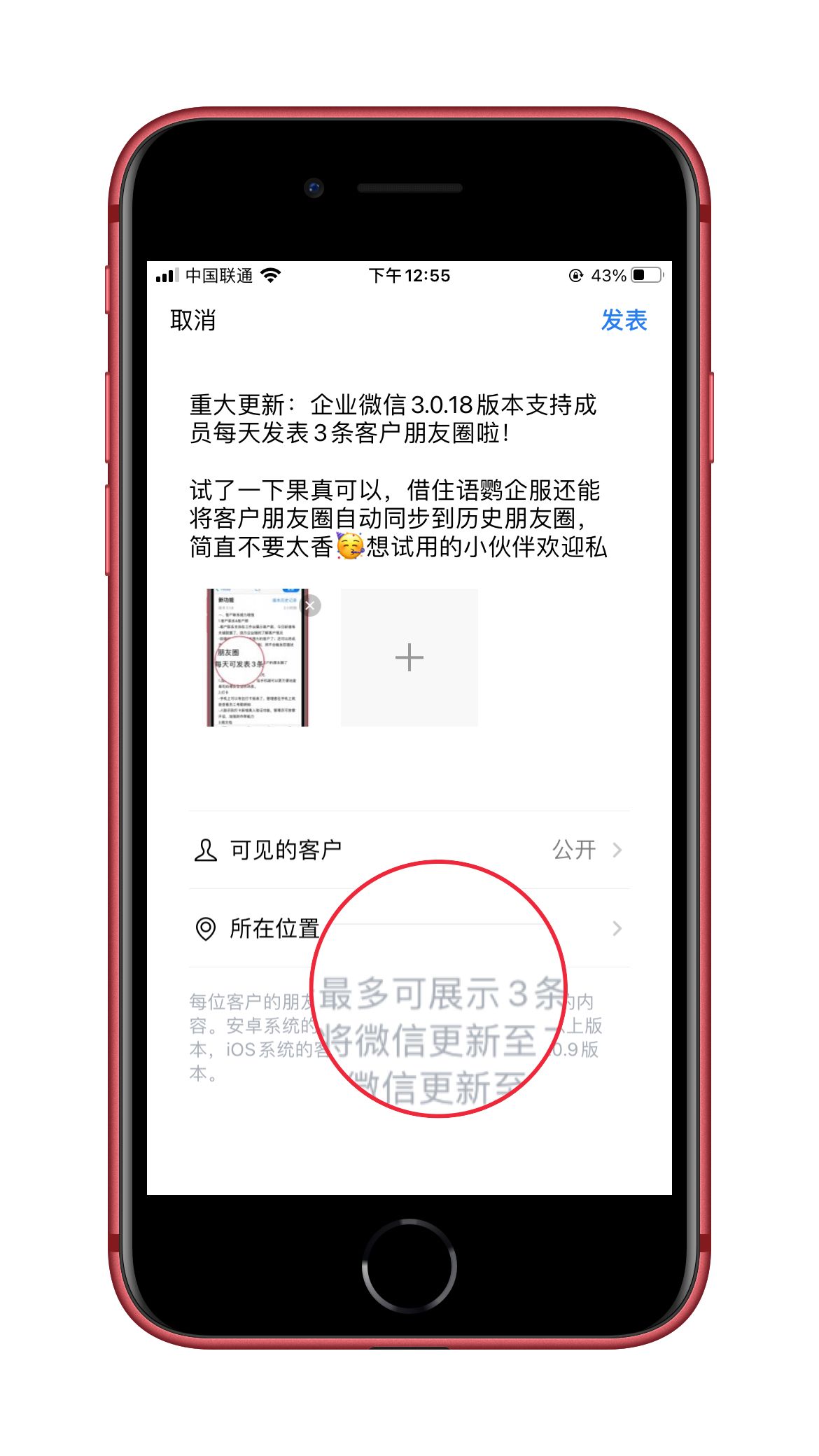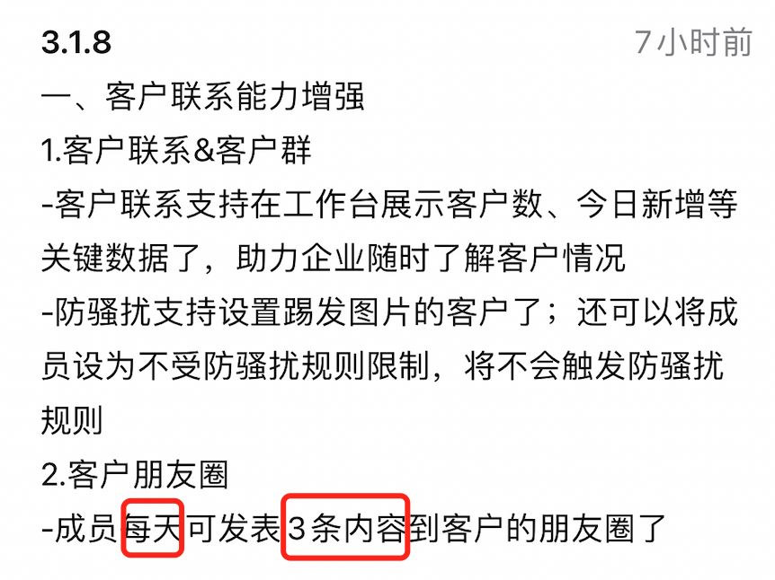 以前,企业微信朋友圈每天只能发送1条内容。而在最新的 3.1.8 版本中,成员每天可发表3条内容到客户朋友圈。这无疑增加了企业在客户朋友圈的展示,增加了品牌营销渠道和活动推广力度。