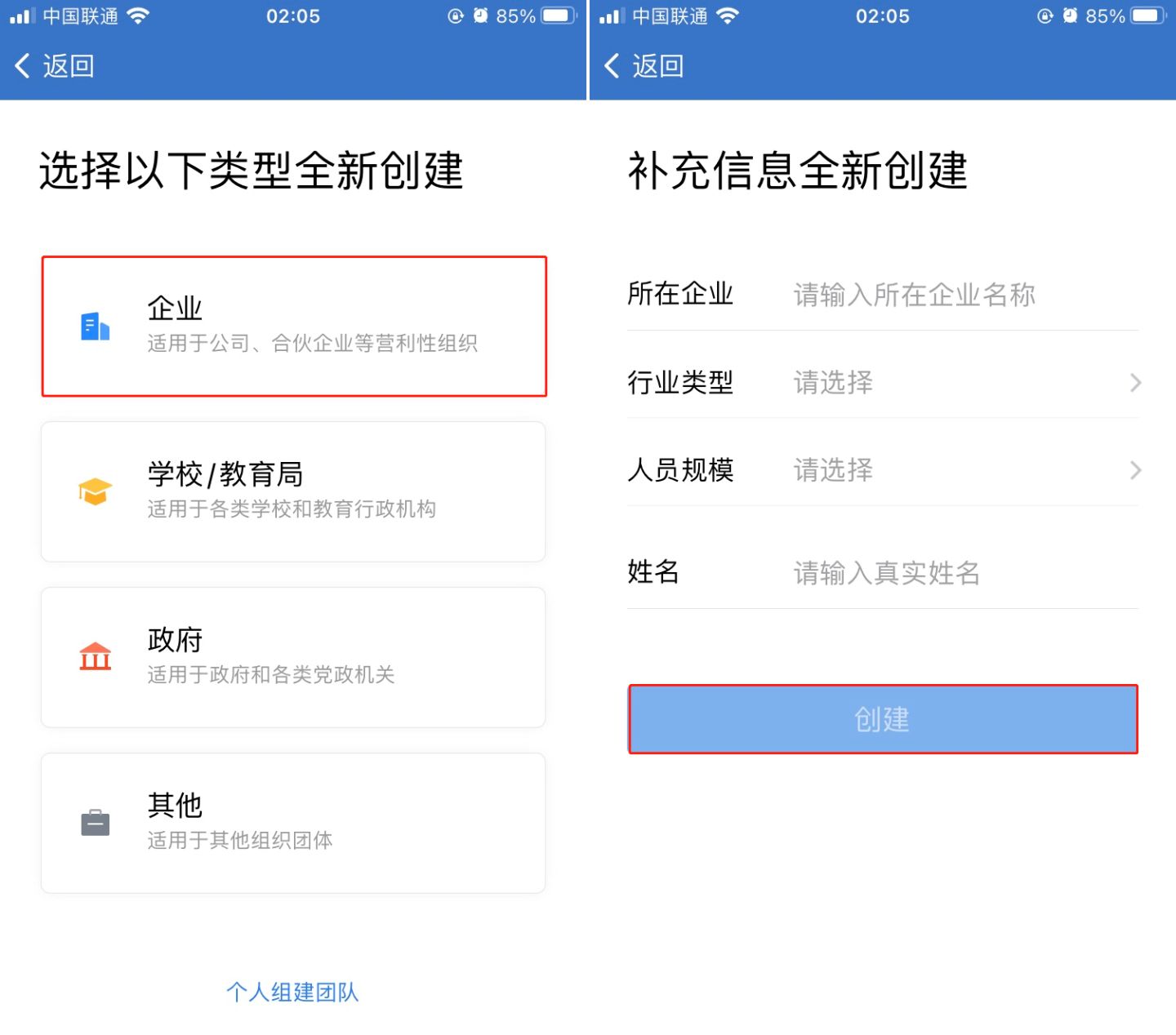 4.进入【全新创建】页面,选择【企业】,依次输入所在企业名称、行业类型、人员规模等信息,最后点击最下方的【创建】按钮,即可完成创建。