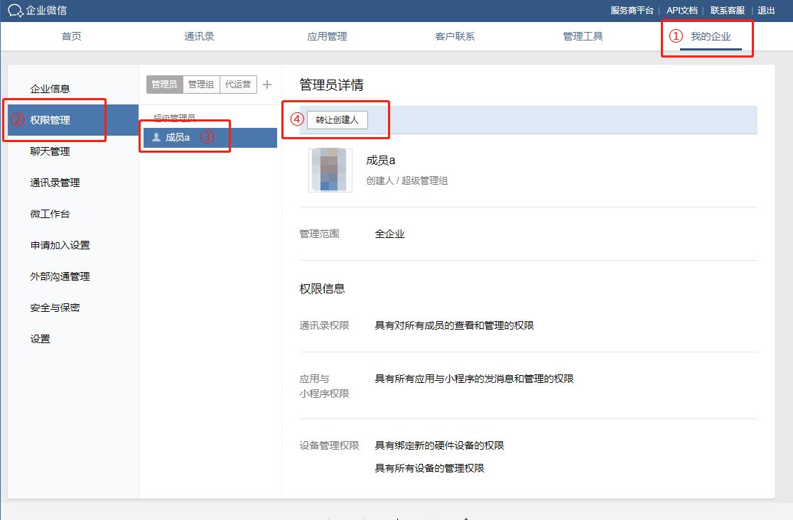 首先需要创建人登录企业微信管理后台,进入【我的企业】-【权限管理】,选择转让创建人,并由创建人使用企业微信扫码确认。
