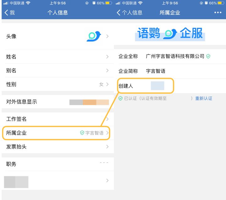 如果你不知道企业微信的创建人是谁?可以打开【企业微信App-我-点击名片信息-所属企业】,就可以看到企业创建人了。