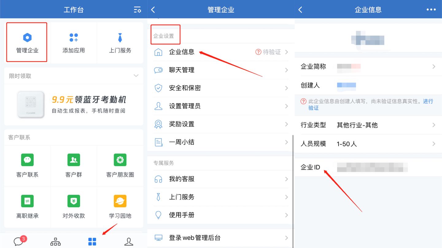首先,管理员打开企业微信APP,点击菜单栏的【工作台】,在对应页面找到【管理企业】选项。进入【管理企业】页面后,找到【企业信息】一栏,点击进入就能看到企业信息,包括企业ID。