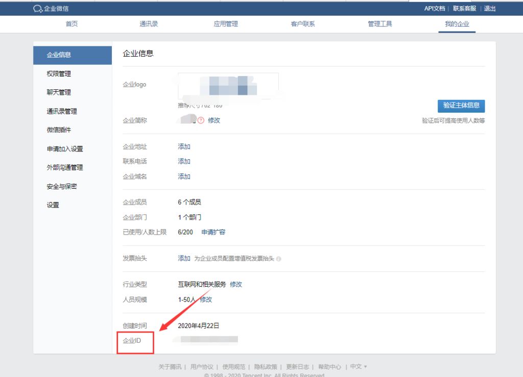 管理员用电脑登录企业微信后,找到【我的企业】,在企业信息页面最底端便可查看企业ID。