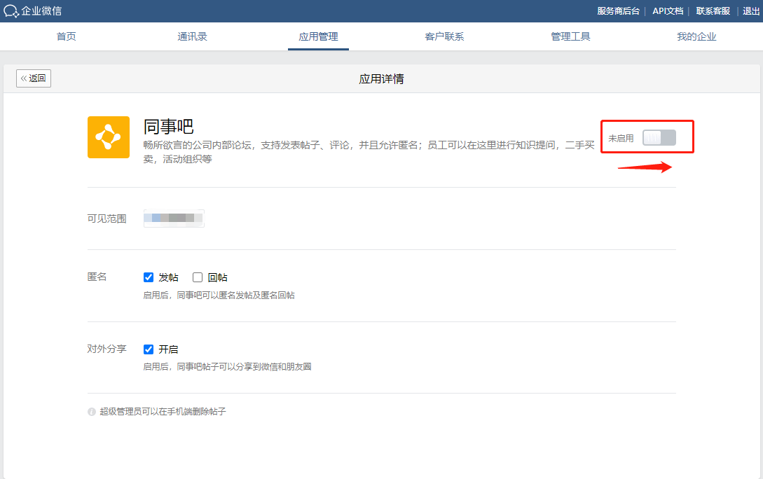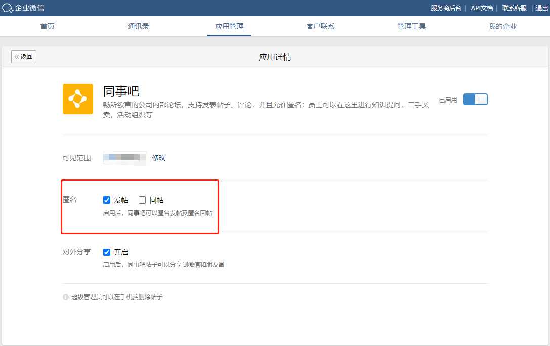 在管理后台里,管理员还可以通过设置同事吧的可见范围,来控制企业的哪些部门可以看到同事吧。这也是有些朋友看不到同事吧功能的一个原因。
