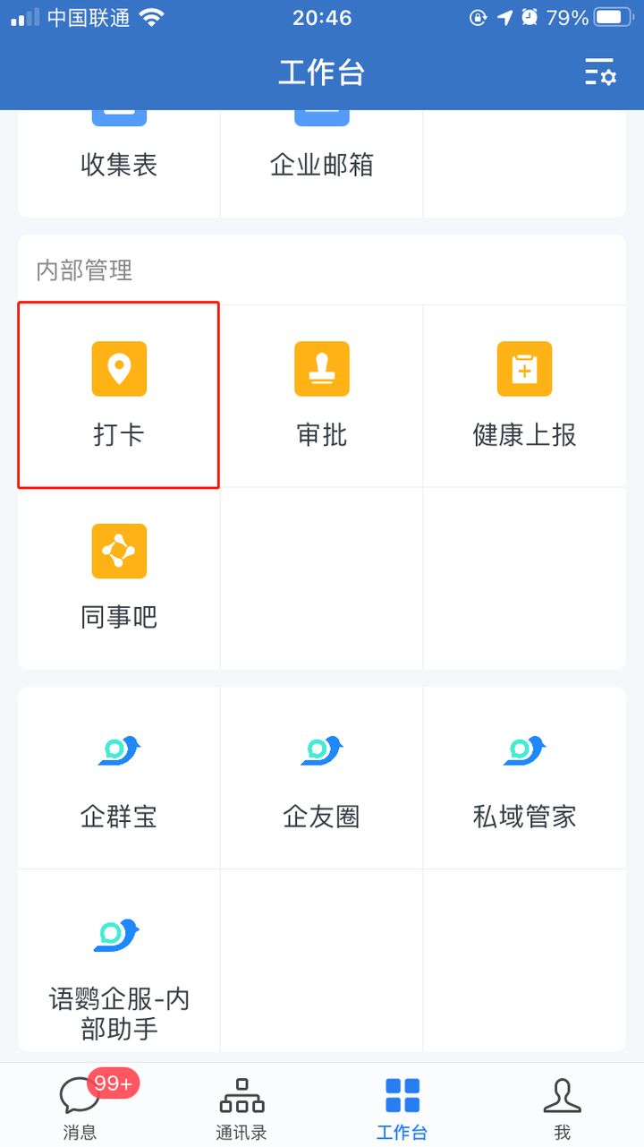 1、登录企业微信手机端后,点击进入「工作台」页面,在「内部管理」菜单内即可看到「打卡」图标。