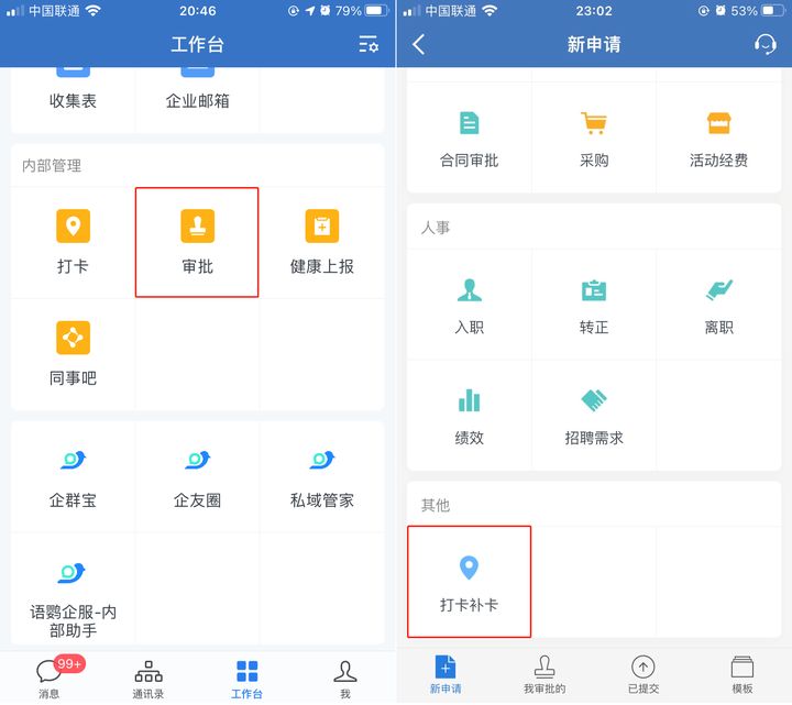 路径三:登录手机版企业微信,点击【工作台】,进入【审批】页面,然后点击最下方的【打卡补卡】,就会跳转到打卡记录,然后点击具体异常记录的日期,进入详情页,再点击【提交补卡申请】即可。