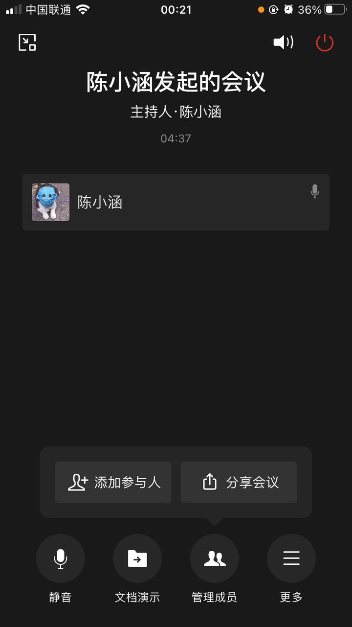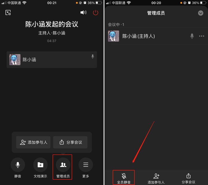 - 在会议页面,点击页面下方的「管理成员」,进入「管理页面」,在底部就可以开启全员禁言了;