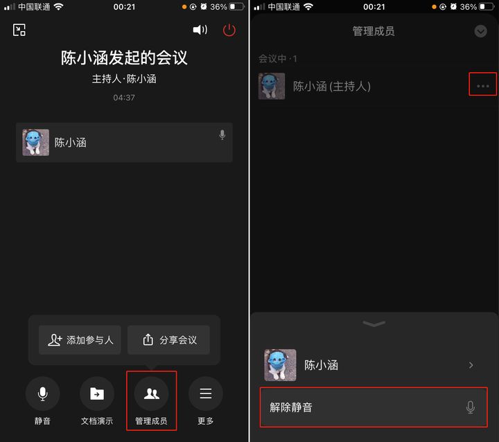 - 开语音会议的时候,可以对单个或者全体成员进行静音或者取消静音;在开视频会议的时候,对单个或者全体成员关闭或者邀请开启视频;