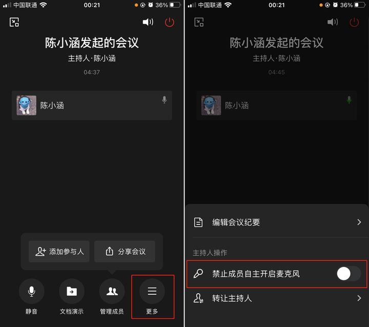 - 如果会议要轮流发言,为了大家的体验,则需要禁言个别成员。依次点击「更多」-「禁止成员自主开启麦克风」,让想发言的成员点击麦克风,向主持人申请发言即可。