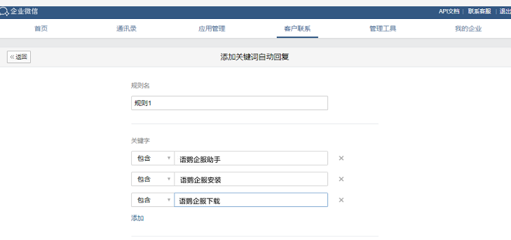 外部群添加机器人的入口是与内部群是一样的,只是需要管理员现在【企业微信管理后台】的【客户联系】-【配置】-【自动回复】中统一添加关键词和自动回复的消息,添加后,群主才可以在群聊中添加自动回复机器人。