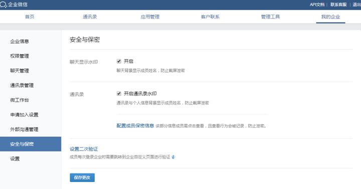 管理员打开【企业微信】进入管理后台,点击【我的企业】进入【安全与保密】页面,即可看到【聊天显示水印】及【通讯录水印】,打勾便可以自动设置聊天水印。