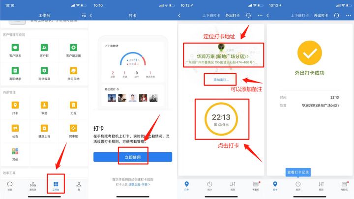 企业微信打卡入口在哪里呢?我们先打开企业微信,点击【工作台】-【立即使用】-选择定位-有特殊情况报备的可以点【添加备注】填写相关的内容,点击打卡,就打卡成功啦!出差时简单几个步骤就可以完成打卡了。