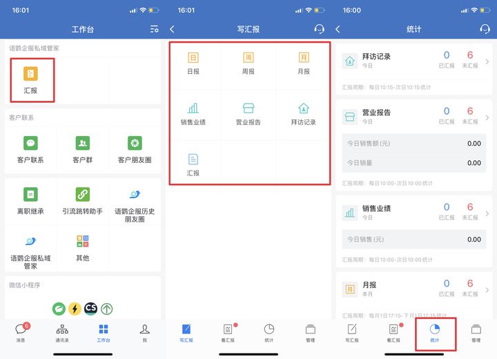员工可以在企业微信工作台中,依次点击「汇报」-「销售业绩」,就会进入汇报页面。根据页面指示,填写今日销售(元)、月累计销售(元)、本月目标(元)、今日工作、明日计划,如果有重要文件,在附件处上传好,就可以了。汇报人如果想集中查看汇报据,进入汇报页面,点击统计就能看到具体数据。