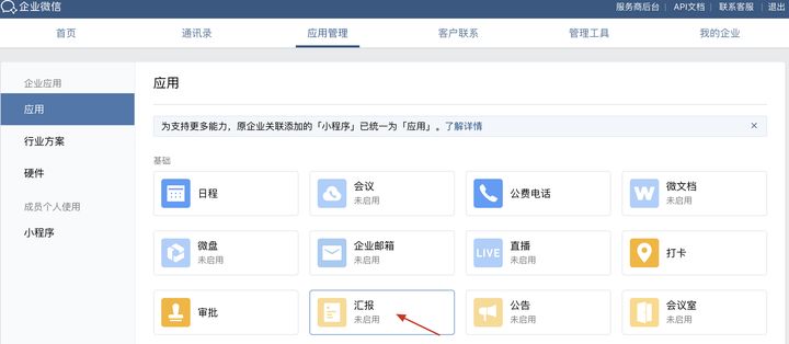 企业微信汇报功能面向全行业,但需要开启后才能正常使用。开启的方式很简单,只需管理员登陆企业微信后台,在应用管理页面找到汇报功能,点击启用即可使用。