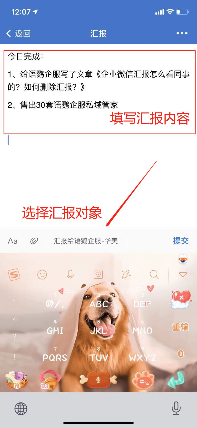 先填写汇报内容,再点击【选择汇报人】-【提交】