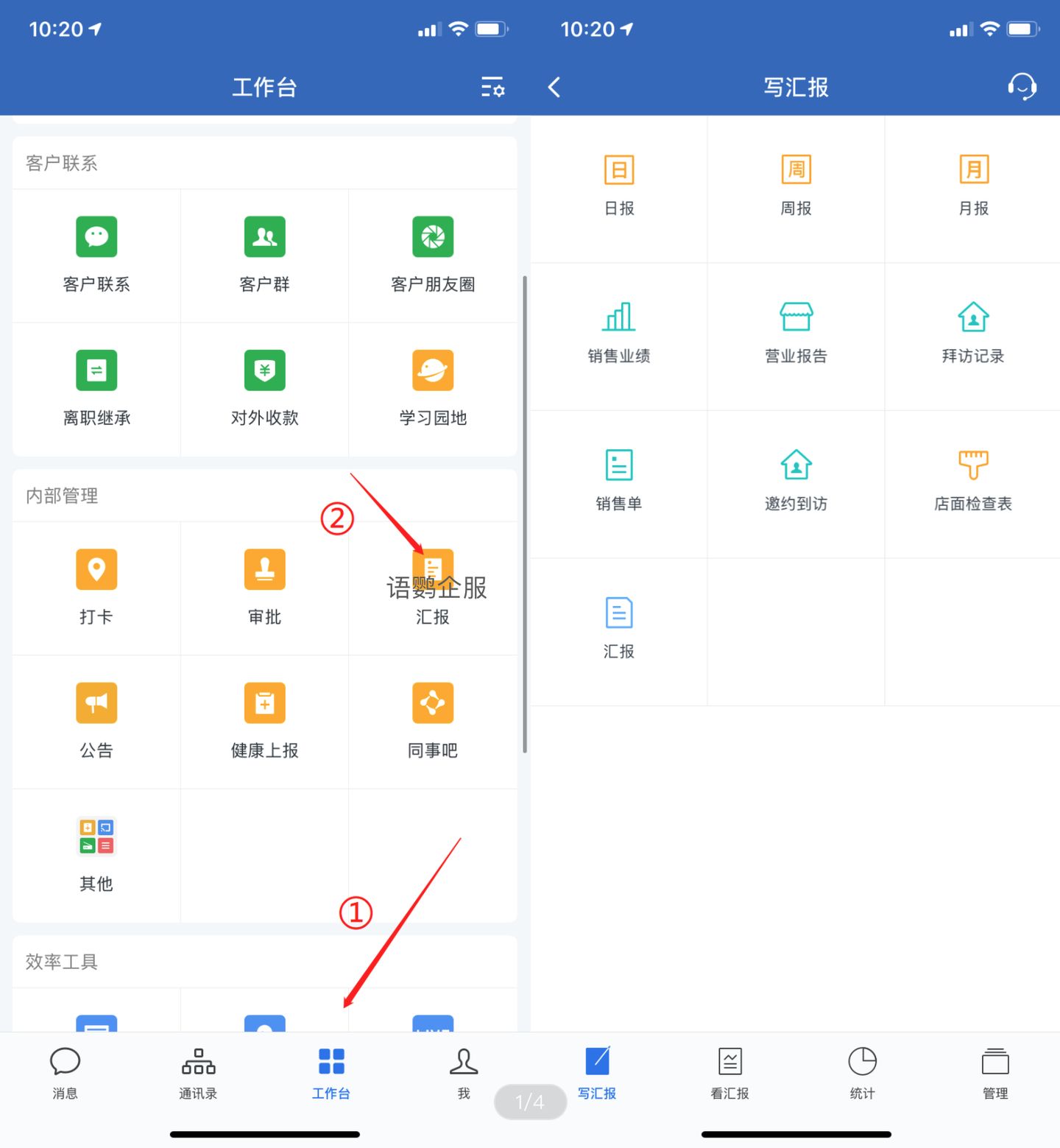 我们先【进入企业微信】-【工作台】-【汇报】-【选择日报、周报、月报、汇报】,通过这个步骤就可以完成提交汇报的动作了。