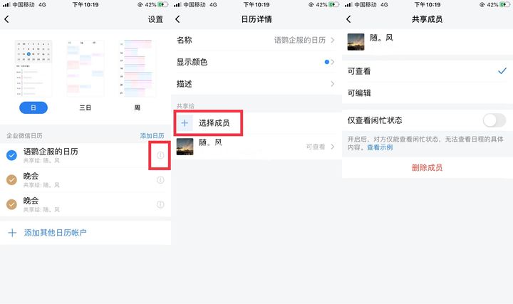 这时我们可以共享日程,操作步骤依次点击:手机端日程页面右上角「…」-日历旁的「i」感叹号符号-「选择成员」即可共享给团队里面的其他成员,这样其他成员也能了解你每天的工作安排及情况,十分适合团队协作。