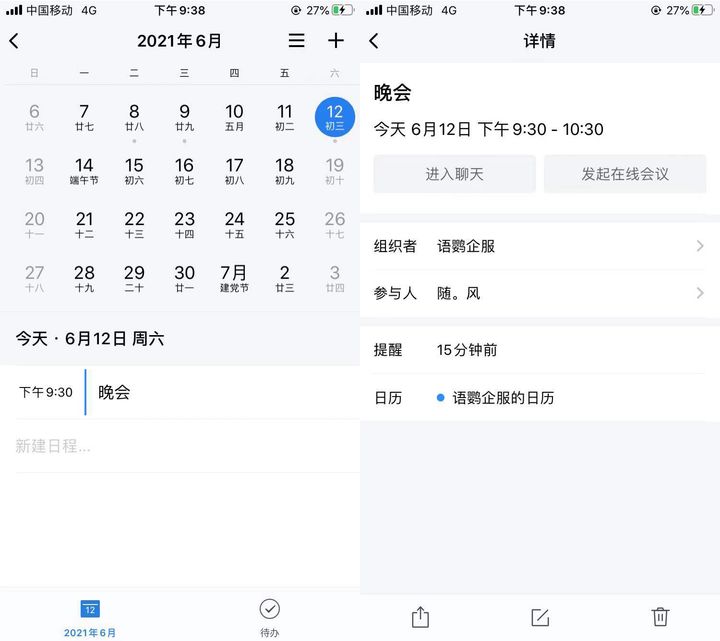 那么在日程设置完成后,我们该如何将日程分享给参与人员呢?企业微信会根据你选定的参与人员自动分享给他们,不需要去手动分享给参与人员。