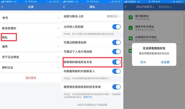 我们只需在企业微信页面点击「我」-「设置」-「隐私」中关闭我的微信好友关系就可以了。