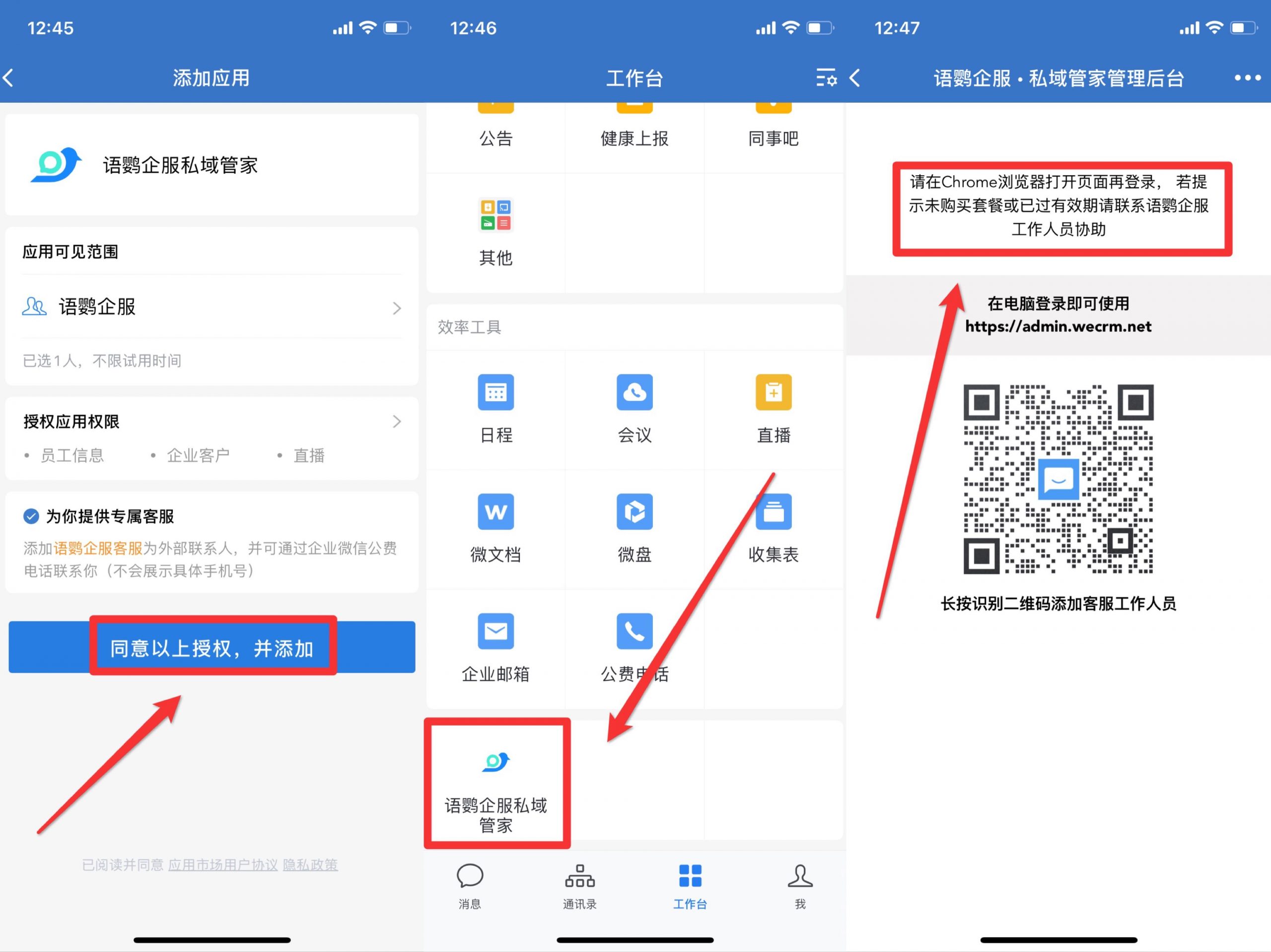 点击「同意以上授权,并添加」,在「工作台」找到语鹦企服私域管家工作人员开通权限后,在Chrome浏览器登录语鹦企服后台