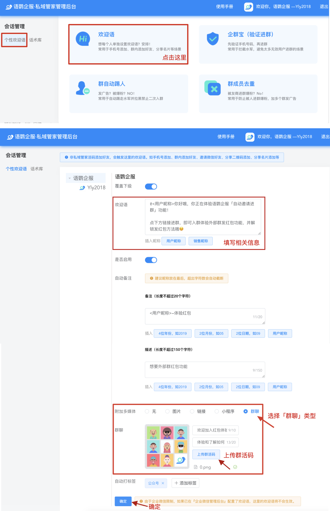 回到语鹦企服管理后台,进入「个性欢迎语」,选择要自动发出群邀请的成员,完善相关信息后,在附加多媒体选项选择添加「群聊」附件,再上传第三步创建的群活码就可以「确认」了,系统会将活码自动转换为入群邀请链接。
