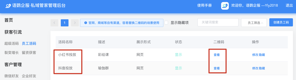 按照第一步多建几个投放到渠道员工活码,点击「查看」并保存员工活码,可以对应投放至抖音、小红书,或线下门店、公众号、地铁等渠道。
