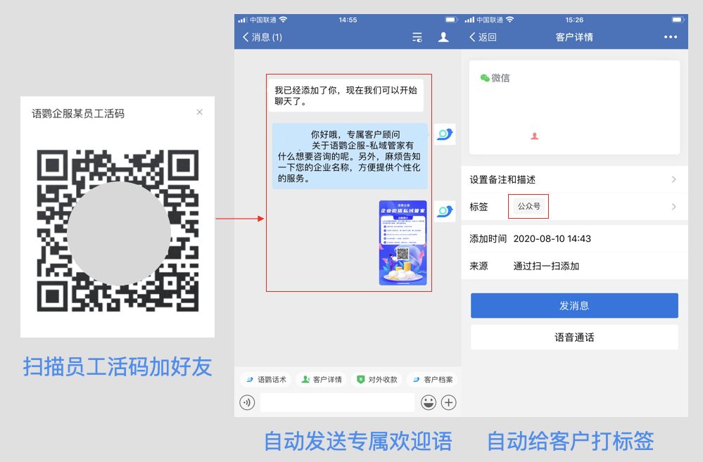 对于早期养号时间不长的企业,也可以用语鹦企服的员工活码通过分散客流的方式实现分流,不仅可以避免企业微信号因为过多添加好友而受到限制,还能自动发送欢迎语、打标签和描述功能!感兴趣的小伙伴欢迎联系语鹦企服免费体验。