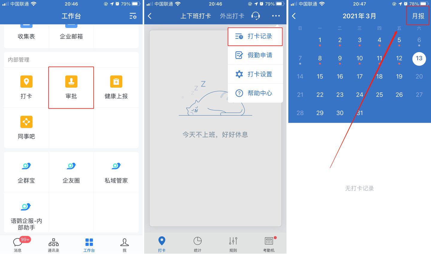 其实很简单,员工只需要打开企业微信手机版,点击【工作台】—【打卡】,进入打卡页面后,点击右上角【···】—【打卡记录】—【月报】,就能查看到自己的加班时长了。
