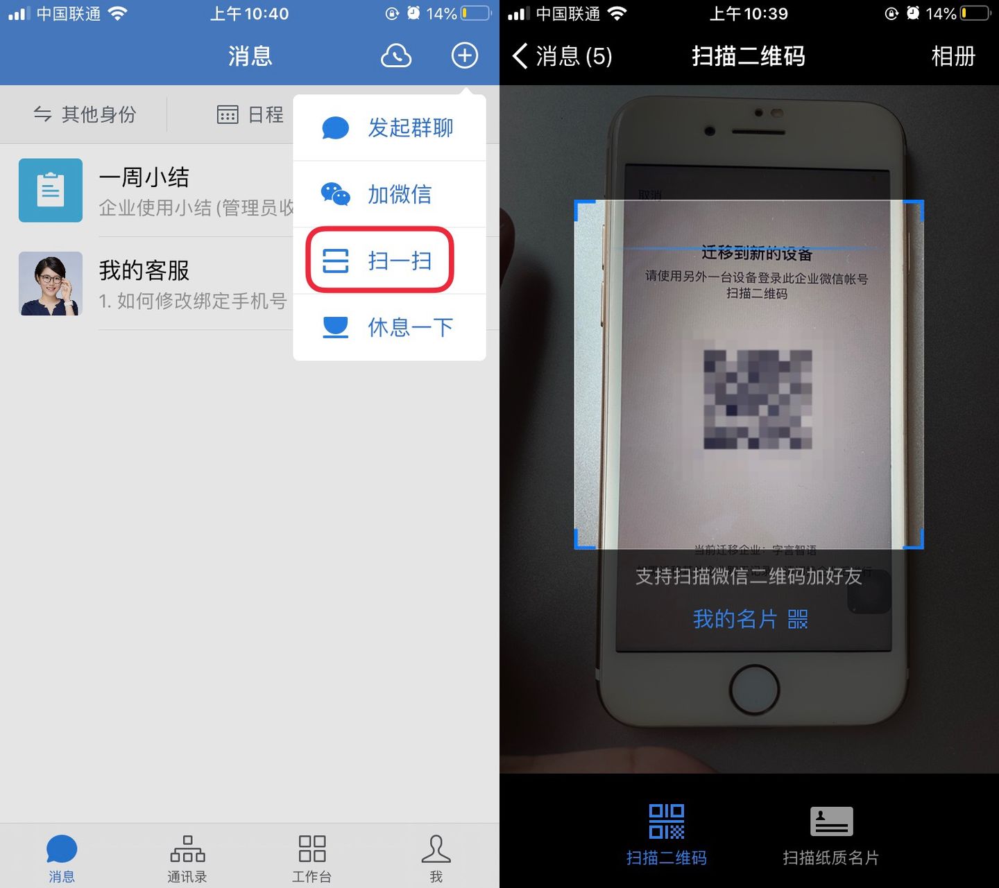 新设备也登录到同一个微信企业中,点击右上角的扫一扫,用新登录设备扫描原登陆设备的二维码。最后,等待聊天记录全部迁移完成即可。