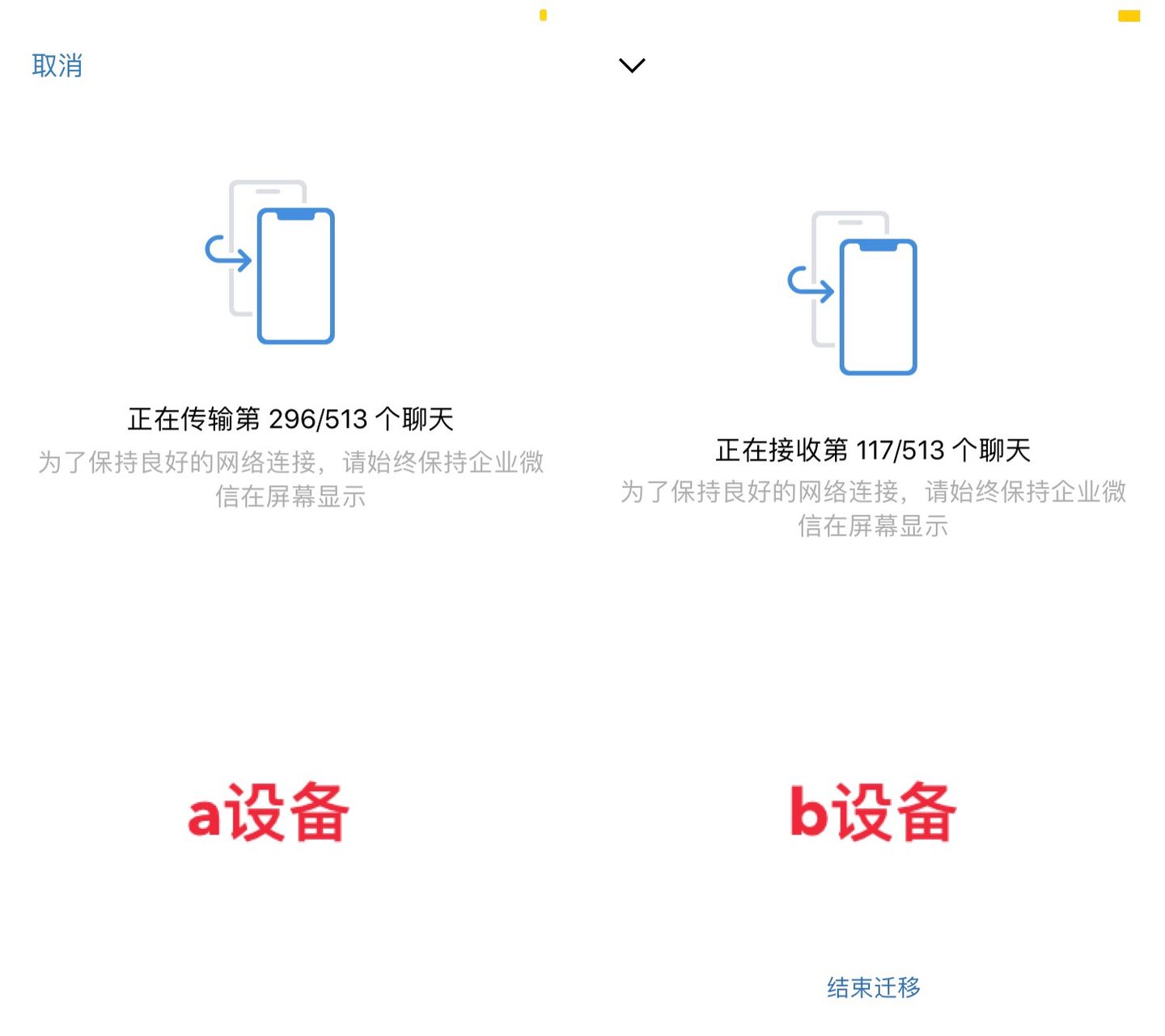 2)在传输数据过程中,注意要始终保持企业微信在屏幕中显示,否则会出现迁移中断,导致需要重新操作。